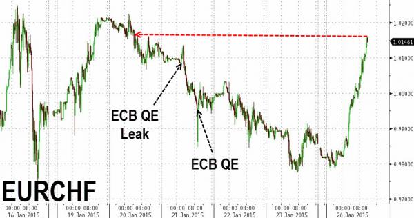 Dopo il monito di S&P’s la Borsa di Atene chiudeva a -3,20%, comunque al di sopra del minimo intraday di oltre -5%, mentre il rendimento del decennale ellenico trattava all’8,87%, il quinquennale al 10,15% e il triennale all’11,764%, in piena inversione dei rendimenti, sintomo di tensione sul breve periodo per la tenuta dei conti del Paese. Ma come vi dicevo prima, nessun contagio verso gli altri bond periferici, visto che Italia, Spagna e Portogallo hanno visto gli spread a ridosso dei minimi storici: Atene, ormai, sembra tradare per conto suo. Guarda caso, poi, ieri il franco svizzero è crollato ai minimi rispetto all’euro da quando è stato tolto il peg fisso, come ci mostra questo grafico, un balzo del +2,70% in un solo giorno di trading, il più grosso calo giornaliero dal 6 settembre del 2011. Forse a Zurigo sanno che Atene dirà “ciao ciao” e temendo un diluvio di euro in arrivo – visto il livello degli outflows di capitale già in atto ora – hanno rimesso all’opera la Banca centrale svizzera, intenta a comprare euro con il badile ieri per deprezzare il franco, magari in attesa di tornare al peg fisso? Altro che rivoluzione greca…