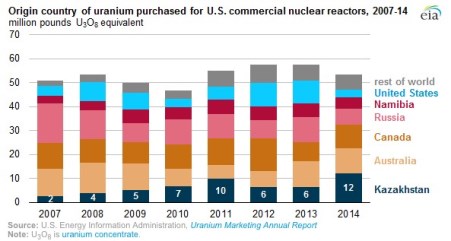 E ora vi spiego perché il Kazakistan, nonostante i suoi guai, possa dormire sonni relativamente tranquilli e godersi il lusso non solo di poter organizzare e ospitare il prossimo Expo, ma anche di minacciare multe verso multinazionali estere che operano sul suo territorio. Anzi, ve lo spiega il primo grafico a fondo pagina, il quale ci dimostra come il Paese sia diventato nel tempo un big della produzione mineraria di uranio e che sia oggi il primo fornitore di questo materiale verso gli Usa, stando a recenti dati della U.S. Energy Information Administration riguardo le forniture nucleari agli Stati Uniti. Insomma, i reattori di Zio Sam si nutrono grazie all’uranio kazako, tanto che gli acquisti statunitensi sono saliti del 50% durante il 2014, un totale di 12 milioni di libbre, il livello più alto di sempre. Inoltre, il livello di offerta del Paese è tale da aver schiantato la concorrenza di fornitori storici degli Usa come l’Australia (10,5 milioni di libbre) e il Canada (9,8 milioni di libbre), tanto che l’uranio kazako ha rappresentato il 23% di tutto il minerale richiesto dagli Stati Uniti per le loro necessità nucleari.