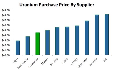 E il perché è presto detto, anzi ce lo dice l’ultimo grafico: il prezzo, visto che nel 2014 il prezzo medio per libbra dell’uranio kazako è stato di 44,47 dollari, 3,50 dollari o il 7,5% in meno di quello australiano e in grado di battere tutti i principali competitor di mercato. Insomma, l’Australia rischia di perdere ulteriori quote di mercato, visto che il Canada nel 2014 ha visto aumentare il suo export verso gli Usa del 25% e che l’industria interna statunitense è la grande sconfitta della partita, avendo registrato un prezzo medio per libbra di 48,11 dollari, ragione che ha portato a un crollo degli acquisti del 65% lo scorso anno.