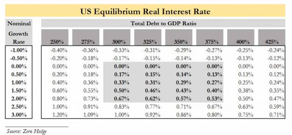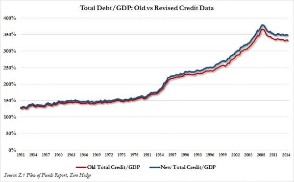 Ed ecco la quarta è ultima variabile, casualmente nata da un report di Deutsche Bank rispetto al rialzo dei tassi negli Usa, ormai previsto da tutti per il 16 dicembre prossimo. Il primo grafico a fondo pagina, ci mostra come dopo la recente revisione del Flow of Funds da parte della Fed, la ratio debito totale/Pil degli Usa sia salita dal 330% al 350%. Quale sarebbe il “tasso di interesse di equilibrio” in questa dinamica? Per Deutsche Bank, con una crescita nominale del 3% e una ratio debito/Pil del 300%, il tasso nominale implicito di equilibrio sarebbe dell’1%, perché con questo tasso, serve il 100% di crescita del Pil per i costi degli interessi sul debito.