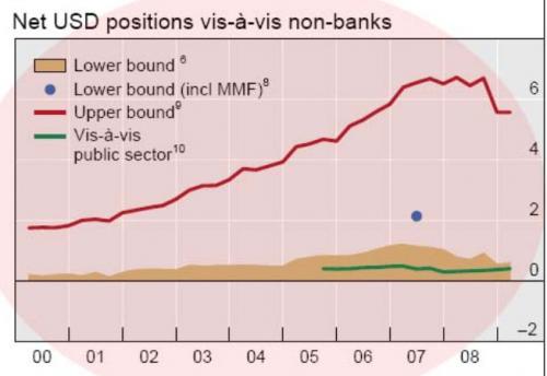 Insomma, per parlare come mangiamo, tra una settimana la Fed se alzerà i tassi, rivelerà al mondo quale sia la reale entità della scarsezza di finanziamento in dollari. L’ultimo grafico è proprio della Bri ed è relativo al 2009, quando la Banca centrale delle banche centrali scrisse che «se tutte le liabilities verso istituzioni non bancarie vengono trattate come finanziamento a breve termine, la stima sale sulla parte alte del bound e vede la scarsità di dollari sul mercato arrivare fino a 6,5 triliardi di dollari». Uno scenario un po’ diverso dall’offsetting che Fed e Bce stanno disegnando e di cui vi ho parlato prima, non pensate? Tanto più che il debito finanziato in dollari a livello globale è salito drammaticamente negli ultimi cinque anni, quindi quel gap sarebbe sicuramente molto ma molto più grande.