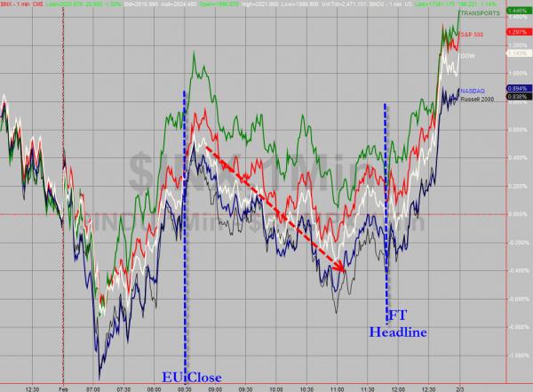 Ma partiamo da principio. Lunedì gli indici Usa sono stati in ribasso per tutto il giorno, zavorrati dal non entusiasmante dato sull’indice manifatturiero, ma di colpo, a un paio d’ore dalla chiusura delle contrattazioni, hanno virato in positivo e sono schizzati su livelli di aumento a tre cifre. Goldman Sachs ieri ci ha detto che il 17% del flusso totale degli acquisti era legato a buybacks azionari, ma questo non ci interessa, se non a livello statistico: ciò che conta è cosa ha reso possibile quei rialzi e ce lo dice il grafico a fondo pagina: l’anticipazione con cui il Financial Times rendeva noto come la Grecia avesse un piano alternativo da proporre ai partner che non comportasse haircuts sul debito. Beh, per far decollare gli indici Usa a quel livello, la soluzione proposta dal ministro delle Finanze ellenico, Yanis Varoufakis, doveva essere davvero geniale. Vediamola rapidamente.