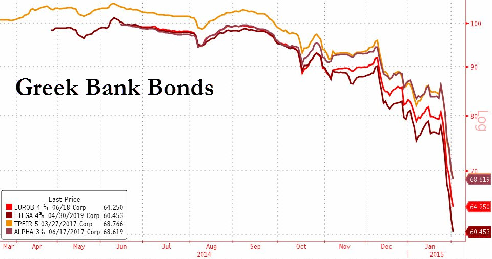 Ma a svelare sottotraccia quale sia il reale problema e la base del bluff greco ci ha pensato lunedì lo stesso Varoufakis, quando ha reso noto di fare affidamento sulla Bce per sostenere il sistema finanziario greco nei prossimi quattro mesi, con iniezioni di liquidità. Di più, potrebbe chiedere a Francoforte 1,9 miliardi di euro, ovvero i profitti guadagnati dalla Bce con l’acquisto di bond greci dopo il salvataggio del 2010. Ora guardate il primo grafico a fondo pagina: quelle linee che si stanno inesorabilmente schiantando al suolo sono le obbligazioni bancarie greche, un trend che parla chiaramente di un haircut che dovrà esserci, al netto del maquillage di sostantivi. Nonostante i bond governativi siano leggermente migliorati, passando sul decennale dall’11.3% al 10,4% di rendimento e la Borsa abbia reagito come il cane di Pavlov alla bufala dello swap guadagnando ieri all’ora di pranzo il 10%, l’epicentro reale della crisi greca è il sistema bancario, non il debito pubblico e la sua sostenibilità. E proprio oggi e domani, la Bce si riunisce per la review bisettimanale dell’Ela, il fondo di emergenza cui le banche greche hanno fatto ricorso nelle scorse settimane attraverso la Banca centrale di Atene per tamponare l’aumento delle sofferenze e le fughe di capitali: continuerà la Bce ad accettare, come ha fatto finora, collaterale non eligibile, ovvero “junk”, dalla Grecia per garantire il finanziamento attraverso l’Ela? Ovviamente sì, altrimenti sarebbe un’ecatombe, ma temo che Mario Draghi farà pesare e non poco quel “sì” ad Alexis Tsipras e il livello di prezzo cui stanno crollando le obbligazioni greche sembra rimandare addirittura l’ipotesi che invece sia possibile anche il “nein” tutto politico di Francoforte. Dico così perché comunque la Bce avrebbe altri modi per finanziare quelle banche zombie e addirittura per continuare a finanziare il Paese se anche il 28 febbraio Atene decidesse di sbattere le porte in faccia alla troika, quindi si sta giocando a chi ringhia più forte, niente più.