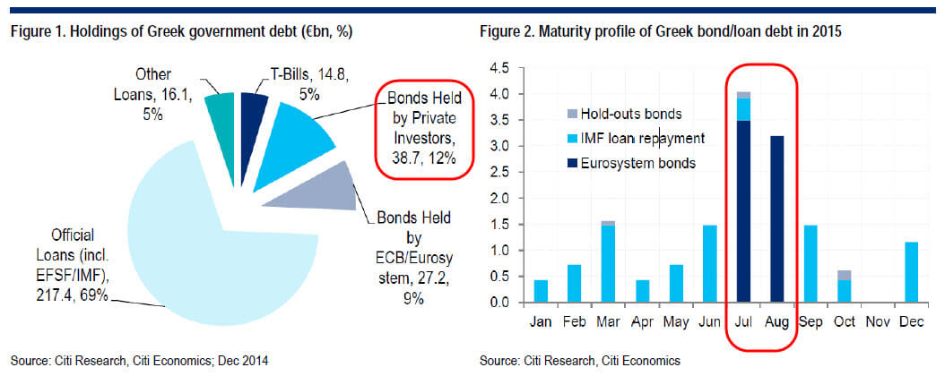 Il problema è quest’anno, visto che al netto delle informazioni pressoché assenti sulle riserve liquide del governo greco, questo mese e a marzo Atene dovrà pagare 3,5 miliardi per prestiti dal Fondo monetario internazionale, tra luglio e agosto poco meno di 7 miliardi di bond detenuti dalla Bce e inoltre debito governativo a breve scadenza, molto del quale dovrebbe subire roll-over da parte delle banche greche (ammesso che non siano fallite), mentre una piccola parte è detenuta da privati che se decidessero di non operare roll-over imporrebbero dei costi allo Stato e quindi drenerebbero denaro dalle riserve.
