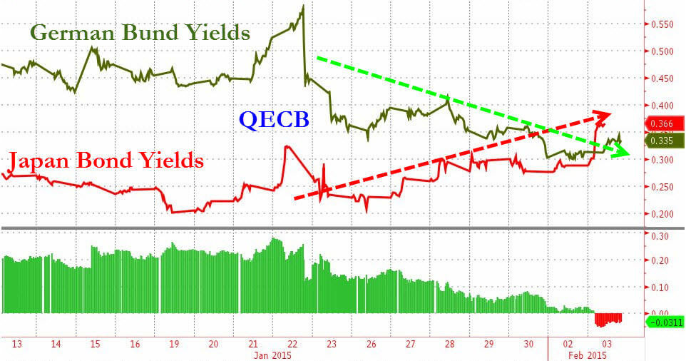 Non a caso, proprio ieri, il rendimento del titolo tedesco a 10 anni è crollato ancora e per la prima volta tradava 3 punti base al di sotto di quello del pari durata giapponese, avendo perso 35 punti base dall’annuncio del Qe, come ci mostra il grafico a fondo pagina: poi non dite che non vi avevo detto che il programma di stimolo dell’Eurotower era il peggior segnale deflazionistico che si potesse inviare ai mercati. In compenso, il risultato molto debole dell’asta nipponica della notte tra lunedì e martedì aggiunge criticità a criticità, visto che dimostra come la Bank of Japan stia cominciando a perdere il controllo su quello che di fatto è il più grande mercato obbligazionario del mondo. Attenti, quindi, al contagio.