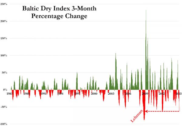 P.S.: E tanto per aggiungere qualche altro dato alla mia sensazione che a livello globale si stia entrando in una nuova fase recessiva, ecco un nuovo aggiornamento sul Baltic Dry Index, il quale ha perso altri 35 punti base, raggiungendo quota 590 e andando sotto il livello di 600 per la prima volta dal 1986, mentre si avvicina sempre più al minimo storico assoluto di 554 toccato nel luglio di quell’anno. E come ci dice il grafico, stiamo parlando del crollo a tre mesi al ritmo più elevato dal fallimento di Lehman Brothers. Qui non si tratta più di sovracapacità o discrepanza tra domanda e offerta, questa è una convergenza strutturale di enorme malinvestment – come ci insegna la Scuola austriaca di economia – e realtà economica.