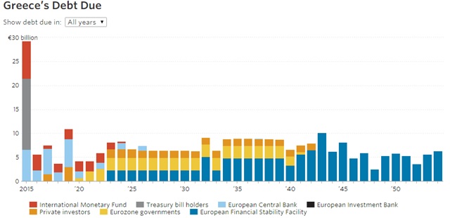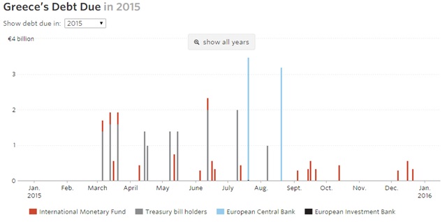 Ma lasciamo la Bce ai sui problemi – tra cui un’unione bancaria che nasce priva di una tre gambe e in cui una seconda è talmente malmessa da essere impraticabile – e torniamo alla Grecia. Le scadenze del debito sono riassunte in questi due grafici. Essi esprimono le scadenze del debito greco in relazione ai vari anni e ai rispettivi creditori. Il primo riguarda tutte la scadenze sino al 2055; mentre il secondo il nodo immediato le scadenze immediate nel 2015.