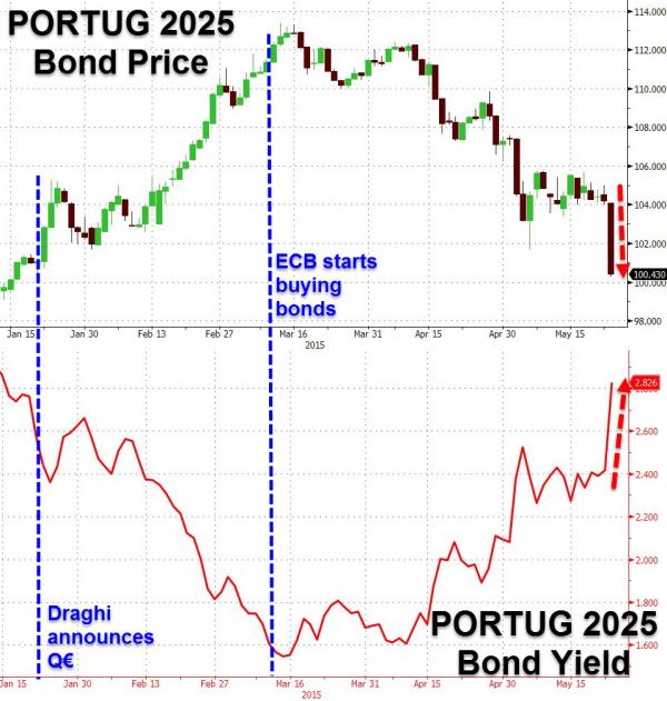 Al netto del Qe della Bce in atto, infatti, la tensione greca ha spedito nuovamente gli spread dei Paesi cosiddetti periferici sull’ottovolante, con buona pace di chi pensava che il “bazooka” di Mario Draghi sarebbe stata la risposta a tutti i problemi. Ma c’è di più. Ricordate che lunedì è stata la giornata nera per gli spread dei cosiddetti Piigs, ma qualcuno ha patito più degli altri, come ci mostra questo grafico: il Portogallo ha visto il suo benchmark decennale schiantarsi letteralmente al suolo a livello di trade reale, non come percezione rispetto a un mercato illiquido. Sintomo che il Paese soffre e, nonostante sia uscito dal programma di salvataggio, non sarebbe di grado di camminare con le proprie gambe in caso di una nuova ondata di crisi.