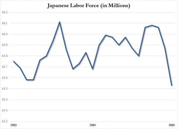 Il problema, poi, è che i giapponesi stanno prendendo la brutta abitudine statunitense di truccare i dati, come ci mostra il primo grafico a fondo pagina. Il quale smonta il miracoloso dato che vede oggi il tasso di disoccupazione nipponico al 3,3%, il livello più basso dall’aprile 1997. Paradossalmente, infatti, se il numero di disoccupati in Giappone è calato di altre 20mila unità, il numero di chi ha un impiego è calato di 280mila unità! E come si da allora ad aver un tasso di disoccupazione più basso? Semplice, si fa in modo che il dipartimento statistico del ministero del Lavoro schianti il numero della forza lavoro, scesa ad aprile di 340mila unità dopo il -190mila di marzo e -20mila di febbraio, abbassando così il tasso di disoccupazione.