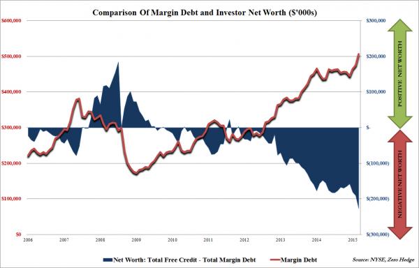 Ancora non vi basta? Tranquilli, c’è dell’altro, come ci mostra il secondo grafico. Il margin debt alla Borsa di New York è infatti cresciuto di 30 miliardi nell’ultimo mese e ha toccato un nuovo record a quota 507 miliardi di dollari, quasi il 50% più alto del picco raggiunto nell’ottobre 2007, prima dell’esplosione della crisi subprime. Insomma, sempre più investitori – soprattutto retail – prendono a prestito denaro per comprare titoli, facendo aumentare a dismisura il rischio di margin call di massa se una correzione dei corsi dovesse incorrere, visto che l’investor net worth, ovvero i soldi reali di chi investe senza doverli prendere a prestito, è ai minimi storici di 227 miliardi di dollari. Ma il terzo grafico ci dimostra come nessuno tema il rischio di crolli, visto che l’indicatore di Deutsche Bank rispetto al sentiment di chi sta investendo sta salendo ancora e si avvicina al livello di “mania” per il ciclo di mercato.