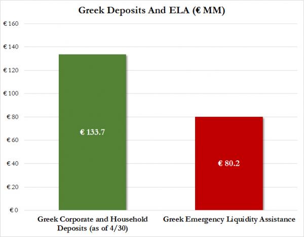 E l’Europa, vuole forse essere da meno? Ma ci mancherebbe altro, ecco quindi che in Grecia i depositi bancari sono calati di altri 5 miliardi portando il totale a 133,7 miliardi, il livello più basso dal settembre 2004. Le banche elleniche hanno perso qualcosa come 32 miliardi in depositi dallo scorso novembre e stanno perdendo altri 167 milioni in media ogni giorno, ma, per loro fortuna e come ci mostra questo grafico, possono contare sui fondi Ela della Bce per restare solvibili. Cosa succederà però se il 5 giugno il governo greco non pagherà il suo debito verso il Fmi? L’Eurotower taglierà o abbasserà le disponibilità Ela per le banche elleniche, di fatto condannandole al default nell’arco di mezza giornata?