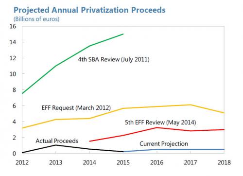 Inoltre, questo piano di privatizzazione non è una cosa nuova, ma fu presentato nel 2011 guarda caso dal Fmi. Peccato che come ci mostra il primo grafico a fondo pagina, subito dopo si scoprì che era una bufala totale, tanto che lo stesso Fondo monetario lo definì «irrealistico». Sapete quanto si otterrebbe dal fondo di privatizzazione per la ricapitalizzazione delle banche elleniche, al fine di renderle solvibili e quindi vendibili? 2 miliardi entro il 2018, quando ne servono 10-14 subito, oggi! Insomma, si continuerà a farle campare con i soldi Ela, verranno ricapitalizzate con parte dell’esborso Ue del nuovo piano e poi si cercherà di venderle. Una partita di giro, assoluta e assurda.