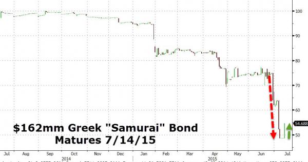 E attenzione, perché se ieri la Grecia ha mancato un altro rimborso nei confronti del Fmi per 450 milioni di euro a causa delle casse vuote, oggi va a scadenza il cosiddetto “Samurai bond” denominato in yen che la Grecia ha emesso nel 1995 per un controvalore di 160 milioni di euro. Il problema è che a differenza delle mancate scadenze verso il Fmi, le quali innescano solo tecnicamente un evento di credito, un mancato pagamento di questo bond potrebbe innescare una cascata cross-default.