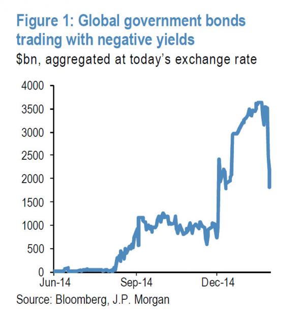 Proprio in risposta a quello che sembra un Quantitative easing senza fine e illimitato, gli investitori obbligazionari hanno infatti scommesso talmente sul prezzo dei bond da portarlo al punto in cui siamo oggi, ovvero a un investimento che incorpora una perdita certa fin dall’inizio. Il perché ce lo dice il grafico a fondo pagina, il quale ci mostra come il 16% dei bond governativi a livello globale abbia un rendimento negativo, un controvalore di 3,6 trilioni di dollari. Quindi, proprio come nella “Dollar Auction”, gli investitori obbligazionari temono di essere il secondo offerente e dover pagare il prezzo intero e portano così il mercato a livello di isteria.