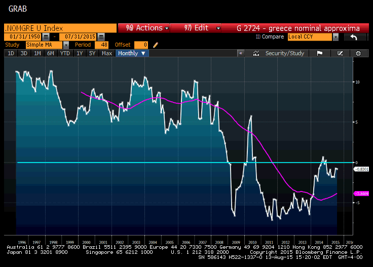 Cosa sia l’animal spirit è presto detto, è la celebre definizione di Keynes per indicare le diverse e imprevedibili motivazioni che spingono gli imprenditori a investire, ovvero un misuratore della crescita in tendenziale. Molti economisti ritengono che il migliore misuratore sia il Pil nominale, ovvero la produzione economica (Pil reale) a cui si somma l’inflazione. Di converso, se abbiamo il Pil nominale, sottraendo l’inflazione abbiamo il Pil reale. E cosa succede, però, se una nazione non ha inflazione ma deflazione, come è il caso attuale di Atene? Fin dalle scuole, tutti hanno un po’ timore nell’addizionare o sottrarre da un numero negativo: di fatto la formula sarebbe Pil nominale=Pil reale+ (-deflazione) o Pil nominale – (-deflazione)=Pil reale. Ma siccome più e meno uguale meno e meno e meno uguale più, questa logica è quella che ha caratterizzato le misurazioni per l’economia giapponese per anni e anni e ora funziona anche per la Grecia. Partendo dal +0,8% di crescita del secondo trimestre, se togliamo la deflazione, abbiamo il cosiddetto “animal spirit” della nazione. E vi assicuro, non è un bel vedere, come ci mostra il secondo grafico.
