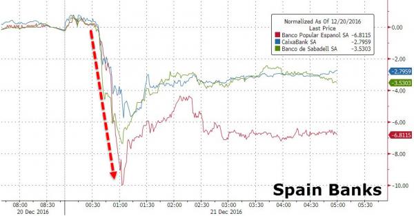 Ma ecco la seconda criticità, spiegataci egregiamente da questo grafico: ieri non solo le banche italiane hanno sofferto, ma anche quelle spagnole e il motivo è la decisione della Corte europea di giustizia, a detta della quale il cut-off point del maggio 2013 legato ai rimborsi per i pagamenti di mutui immobiliari a prezzi non equi, è illegale. Insomma, i contraenti che hanno pagato troppi interessi su mutui immobiliari precedenti alla legge spagnola del maggio 2013 sui cosiddetti mortgage floors (i massimi applicabili sui mutui) possono richiedere il rimborso alle banche con cui hanno acceso il mutuo: così ha deciso la Corte europea del Lussemburgo, facendo letteralmente schiantare i titoli del comparto bancario iberico.