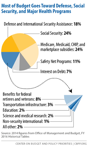 Stando al Center On Budget & Policy Priorities e come ci mostra il grafico a fondo pagina, oggi circa il 75% di ogni dollaro proveniente da tassazione finisce in spesa non produttiva. Non è una società di libero mercato, è l’Unione Sovietica con i McDonalds e i Wal-Mart. È questo il vero kicker politico di queste elezioni, anche se declinato ed espresso nel linguaggio rozzo di Donald Trump. Nel 2014 il governo federale ha speso 3,5 triliardi di dollari, circa il 20% dell’intero Pil nazionale. Bene, di questa cifra totale, 3,15 triliardi sono stati finanziati da introiti fiscali e 485 miliardi attraverso il debito. In altre parole, c’è voluto quasi l’intero introito fiscale ottenuto dal governo solo per coprire le spese di welfare sociale e di servizio del debito: in ambito finanziario, quando prendi a prestito denaro da altri per pagare ciò che altrimenti non potresti permetterti si chiama Schema Ponzi, ovvero una truffa che ti porta in galera. Bene, il governo Usa è un truffatore legalizzato da triliardi.