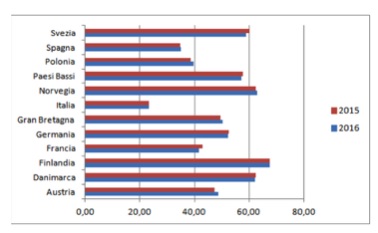 L’Italia ha poi il triste primato di essere ultima nel ranking riguardante tutti i pilastri. Le maggiori differenze rispetto alla media europea si riscontrano nei pilastri della trasparenza, delle regole, della libertà economica e delle pari opportunità. Il divario rispetto agli altri stati membri dell’Ue sta crescendo, come si vede nel secondo grafico: il nostro Paese, rispetto al 2015, si conferma in un’ultima posizione nel ranking europeo, con un punteggio di 23,4 con più di 40 punti di distacco dalla Finlandia (67,7), 20 dalla Francia (41,5) e quasi 30 dalla Germania (52,3); punteggio inferiore di oltre 16 punti della Polonia (39,6) e 12 punti della Spagna (35,1).