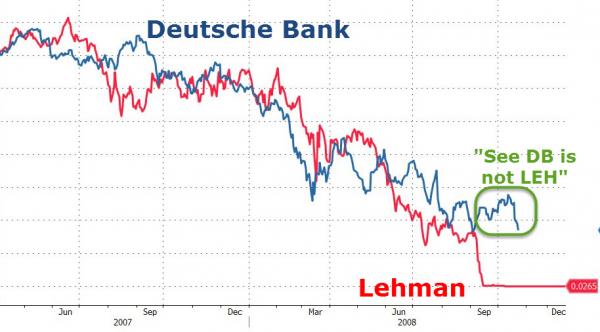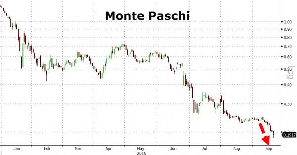 Soltanto lo 0,5% degli assets finanziari mondiali sono assicurati in forma di oro fisico: quando arriverà la botta, sarà tremenda. Certo, nessuno ha la certezza del fatto che il problema sia quello dei derivati o dei tassi di interessi negativi che incidono negativamente sui profitti o sulle turbolenze nell’eurozona post-Brexit e post-Bratislava. ma qualcosa comincia ad andare fuori controllo, come ci dimostrano i due grafici a fondo pagina, il primo relativo alla comparazione del trade dei titoli di Lehman Brothers e Deutsche Bank e il secondo che invece ci mostra come l’azione di Mps martedì sia scesa al livello record negativo, andando sotto quota 20 centesimi.