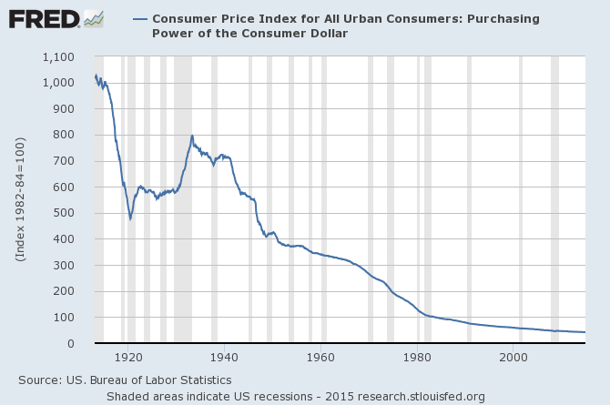 Senza ma, appunto, evase le “leggi censuarie”, gli abiti passeranno di moda; i pubblicitari dispenseranno i consigli per gli acquisti; quelli del marketing confezioneranno la domanda di tutto per tutti a più non posso. Già, di più non posso però se, come mostrano quelli della Federal Reserve Bank of St. Louis (grafico più in basso), dai primi anni ‘30 a oggi, il potere d’acquisto subisce una costante riduzione.