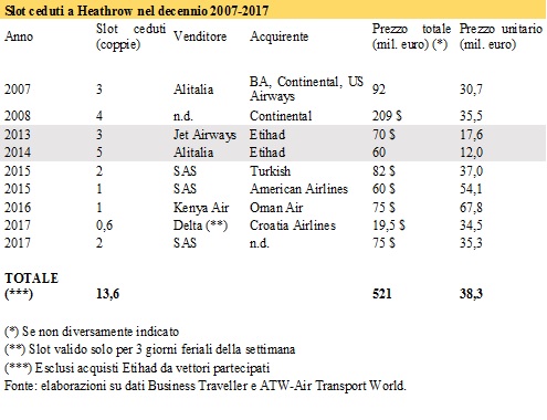 Utilizzando due testate specializzate abbiamo provato a ricostruire tutte le cessioni di slot a Heathrow avvenute nell’ultimo decennio e di cui è stato pubblicato il prezzo. Esse sono riportate nella tabella sottostante. Come si può vedere in nessun caso il prezzo è mai sceso al di sotto del valore unitario ottenuto da Alitalia nel 2007 e in un paio di casi ha superato i 60 milioni a coppia. Vi sono due sole eccezioni che riguardano entrambe Etihad come acquirente e aziende da essa partecipate come venditore: oltre all’acquisto da Alitalia, ve n’è infatti un altro che ha riguardato l’indiana Jet Airways, ma in questo caso il prezzo unitario è stato di 18 milioni. Se si escludono tali transazioni, il prezzo medio delle rimanenti è di oltre 38 milioni l’una, 26 in più di quanto pagato da Etihad. Pertanto mai slot di Heathrow risultò meno caro nell’ultimo decennio rispetto a quelli che Etihad ottenne da Alitalia. Fu vero prezzo di mercato? La nostra tabella sembrerebbe dirci di no. Ed Etihad sembrerebbe aver risparmiato per cinque volte 26 milioni, per un totale di 130 milioni.