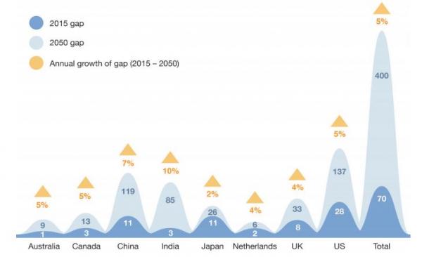 Di più, poco meno di 1 adulto americano su 4, il 23%, non è in grado di pagare tutte le bollette mensili, mentre il 25% ha fatto saltare alcune spese mediche l’anno precedente. Direte voi, meno male che ci sono i pensionati, gli anziani che con i loro risparmi e le pensioni d’anzianità aiutano sempre di più le famiglia di difficoltà, negli Usa come in Europa. Proprio sicuri? Questo grafico, estratto dall’ultimo studio del World Economic Forum, ci dice non solo che, a oggi, negli Usa i fondi pensione pubblici sono sotto-finanziati per 4 triliardi di dollari, ma che, soprattutto, entro il 2050 a livello globale quel sottofinanziamento potrebbe toccare i 400 triliardi di dollari, stante la dinamica demografica e occupazionale in atto.
