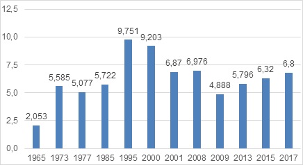 Questa carenza di offerta sul lungo raggio si può osservare ancora meglio in base alla capacità della flotta in termini di posti passeggeri totali a bordo (Grafico 4). Essa è stata in crescita dal 1965 al 1995, pur con la battuta di arresto delle due crisi petrolifere, ed è passata da circa 2.050 posti nel primo anno considerato a 9.800 nell’ultimo. Il discorso cambia radicalmente dopo il 1995: nel 2001, qualche mese prima delle torri gemelle, la capacità è drasticamente ridotta a 6.900 posti (-30% rispetto al 1995) mentre nel 2009 il nuovo vettore privatizzato debutta con una capacità a lungo raggio di soli 4.900 posti, la metà esatta rispetto al 1995 e un valore più basso rispetto a quello del 1973, 35 anni prima. Oggi essa è nuovamente ritornata all’incirca al livello al quale era pervenuta col ridimensionamento del 2001, tuttavia in questo periodo i passeggeri intercontinentali diretti da e per l’Italia sono saliti da 10 a quasi 18 milioni, un incremento che è stato integralmente lasciato ai vettori non europei concorrenti. Infatti, se Alitalia non offre adeguati collegamenti diretti a lungo raggio dal nostro Paese non possono farlo al suo posto vettori europei concorrenti, date le restrizioni regolamentari vigenti. Essi possono offrire solo collegamenti indiretti tramite i loro hub nazionali (essenzialmente Parigi, Francoforte, Amsterdam e Londra), ma si tratta, evidentemente, di un servizio non equivalente tanto per gli italiani in uscita che per gli stranieri in entrata.