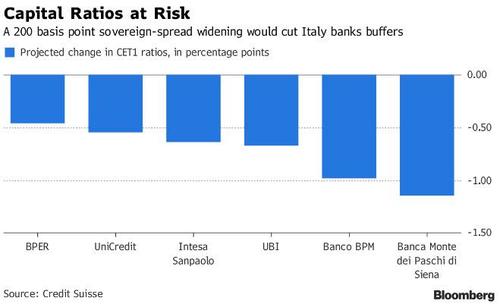 Attenzione, però. A questo. Le nostre banche, dall’altro giorno, sono sotto vigilanza rafforzata delle autorità europee rispetto ai livelli di liquidità. Ovvero, Bruxelles vuole controllare che abbiano patrimonio sufficiente a restare solvibili, a fronte dell’aumento dello spread. E il perché di questa mossa, rilanciata l’altro giorno dalla Reuters, è presto detto dal primo grafico, il quale ci mostra plasticamente la radice di ogni male: ovvero, la quantità esorbitante di debito pubblico in pancia alle nostre banche rispetto alla media europea. Il doppio. Il famoso doom loop. E il secondo grafico ci mostra l’impatto patrimoniale atteso su alcuni nostri istituti, in base a uno scenario di aumento dello spread di 200 punti base. Insomma, la famosa quota 400 in base alla quale, per la ricerca di Ubs, i nostri istituti di credito dovrebbero ricorrere a ennesimi e costosissimi aumenti di capitale.
