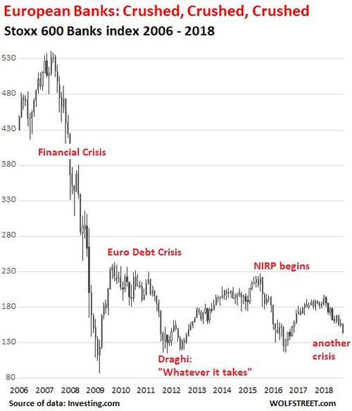 L’indice europeo delle banche è al minimo da due anni e il grafico ci mostra come ormai l’andamento sia chiaro: la crisi in atto nel comparto strategico del credito è strutturale e sistemica, capitanata da quel colosso dai pieni d’argilla e dai bilanci zoppicanti di Deutsche Bank, crollata ieri al Dax dopo la presentazione della trimestrale. E vogliamo parlare dei prestiti allegri delle banche spagnole? Dei Btp in pancia a quelle francesi o belghe, le quali devono fare i conti anche con il ricasco sociale che avrà la prossima crisi su imprese e famiglie, visto che proprio Parigi e Bruxelles sono epicentri delle criticità europee legate al debito privato? Molto più comodo puntare il dito solo sull’Italia e sulla sua manovra che non sta alla regole, invece di dire chiaramente che, nonostante tutta la liquidità della Bce, lorsignori sono ancora alla canna del gas, il tutto senza che l’economia abbia sicuramente vissuto alluvioni di credito per ripartire seriamente.