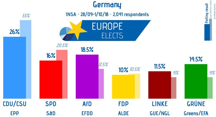 Lasciate stare lo spread a 311, anche perché – ragionate – non è che il giorno prima avesse chiuso le contrattazioni a 87: era in area 280, quindi è bastato un singolo soggetto che si sia alleggerito un po’, oltretutto nel primo giorno effettivo di dimezzamento dell’ammontare di acquisti mensili della Bce. Non ci voleva molto ieri mattina a creare il panico, fidatevi. Ve l’ho detto, ora tutto ruota attorno a due criticità. Una di medio-lungo termine, ovvero garantire un casus belli alla Bce per continuare la sua opera di supporto all’economia dell’eurozona, prima che sia la disputa Usa-Cina a crearlo, ma in modo disordinato e ostile. Seconda criticità, di breve termine, ce la mostra questa tabella, elaborazione del sondaggio Insa condotto fra il 28 settembre e il 1 ottobre fra 2.041 cittadini tedeschi in età di voto: parla da sola, Alternative fur Deutschland non solo a livello nazionale è secondo partito ma stacca l’Spd di due punti e mezzo. Il tutto, a meno di due settimane dal fatidico voto in Baviera del 14 ottobre e con la Merkel politicamente mai così debole.