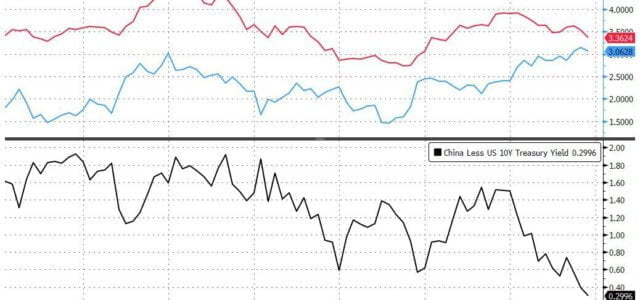 E attenzione, perché un potenziale game changer figlio legittimo delle tensioni commerciali starebbe per emergere, come ci mostra questo grafico: è fresco fresco, fa riferimento al pre-market di ieri e ci dice che il rendimento del titoli decennale sovrano cinese ora è soltanto 29 punti base più ampio di quello del pari durata Usa. Tradotto? La deflazione cinese sta arrivando. E come si combatte la deflazione?