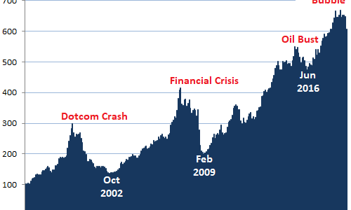 Ce lo mostrano il secondo e terzo grafico. Dai quali notiamo che durante il boom del mercato iniziato con la grande crisi finanziaria del 2008 e durato fino ai giorni nostri, il margin debt è continuato a crescere, di massimo in massimo, fino a raggiungere il suo picco nel maggio scorso, quando toccò i 669 miliardi di dollari, su del 60% dall’apice pre-crisi del luglio 2007 e del 117% dal gennaio 2012. Bene, da quel picco di sei mesi fa, il margin debt è sceso per un controvalore di 62 miliardi di dollari, un bel -9,2%, di cui appunto 40,5 miliardi solo a ottobre di quest’anno. Il terzo grafico ci mostra la correlazione storica recente fra aumento del margin debt e crolli di mercati azionari ai massimi: quando nell’ottobre del 2002 si arrivò alla fine dello scoppio della bolla dot.com, il Nasdaq era calato del 78%, mentre nel medesimo arco temporale il margin debt era sceso del 54%. Uno scenario simile si è verificato durante la bolla subprime del 2008.