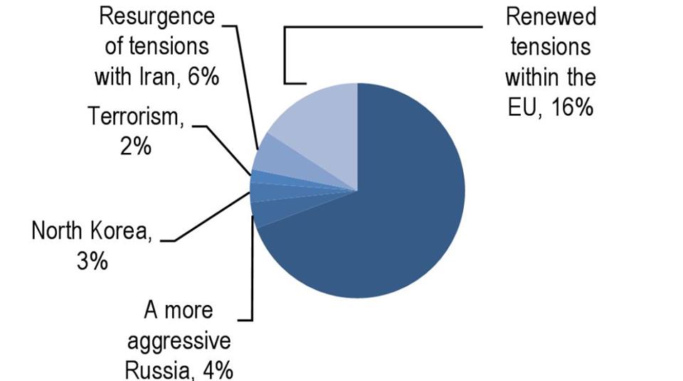 Guardate la “torta” più in basso, fa parte dell’ultimo report di JP Morgan, pubblicato giovedì e dedicato ai principali tail risk globali nella visione dei grandi manager della finanza, principalmente gestori di fondi. Come vedete, la Russia e la sua presunta volontà di intromissione politica non appare esattamente una priorità. Sapete qual è la voce mancante, quella della parte blu maggioritaria nel grafico? L’incertezza della politica negli Usa, in principal modo legata al commercio. Insomma, chi investe sa qual è il problema. E dove risiede. Ma si sa, la narrativa – come diceva Goebbels – non necessita di basi di verità. Anzi, più una bugia è spaventosa e inverosimile, più viene accettata per vera, se veicolata a dovere e con martellante assiduità. E per quanto non abbia alcuna base reale, la criminalizzazione della Russia legata al Russiagate, alla fine, è riuscita a introdurre e inoculare nelle vene dell’opinione pubblica una dose minima di russofobia che permette manipolazioni in serie. E di alto livello.