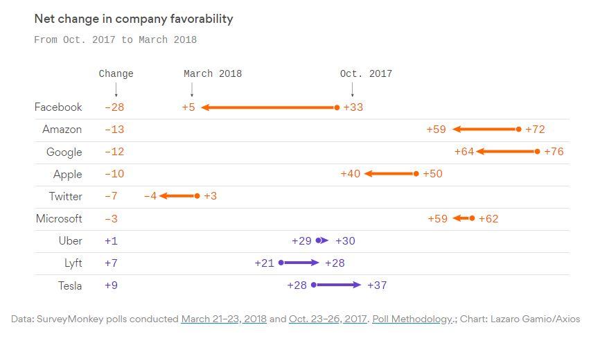 A proposito, guardate questo altro grafico: nonostante le patetiche accuse che vengono mosse contro il social network (sperare nella privacy operando su quelle piattaforme è come sperare di trovare il fresco a Tunisi il 10 di agosto), il social network di Zuckerberg sta perdendo consenso, fiducia e credibilità fra la gente. Oltre che aver perso già il 20% di capitalizzazione in una settimana di trading.