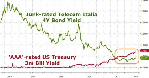 Ne parleremo domani e penso anche per il resto della settimana: siamo allo snodo epocale, le miserie elettorali italiane lasciamole pure dove sono. In un caos globale simile, chi vince e chi perde nella guerra delle promesse da ubriaco verso palazzo Chigi è davvero l’ultima delle nostre preoccupazioni. Volete sapere quale è la prima o dovrebbe esserlo, almeno a mio modesto avviso? Ce lo mostra quest’ultimo grafico, il quale fa da corredo immaginifico alle parole di un guru di Wall Street come Jim Grant, non a caso noto come “Mr. Market”, pronunciate quando qui era la notte pre-elettorale, parlando alla CNBC: «Volete un esempio di come il mondo stia sbagliando completamente a prezzare i tassi di interesse? Guardate all’Italia, che sta tenendo importanti e potenzialmente devastanti elezioni politiche questa domenica… c’è una security di grado speculativo, il bond Telecom Italia scadenza 2022 a 5 e ¼ di rendimento, che sta tradando allo 0,8% di yield, pur essendo di fatto un junk bond con handle a zero”.
