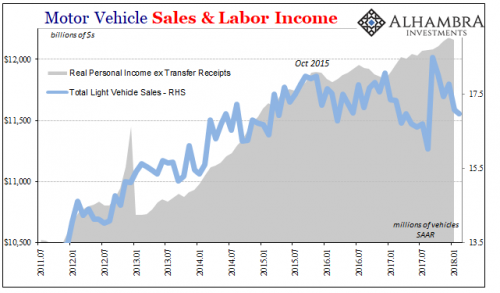 Pare di no e la questione è seria, per due motivi. Il primo è legato al fatto che l’industria aveva operato break-even e piani industriali su previsioni di crescita dovute allo spillover continuo dei danni compiuti dagli uragani Harvey e Irma: non è andata così. Il secondo ce lo mostrano questi tre grafici: negli Usa si vendono solo mezzi commerciali – e di basso consumo -, mentre le auto no. E, anche quando si vendono – grazie al credito al consumo e agli incentivi/sgravi federali – non sono i marchi statunitensi a essere comprati. Da agosto 2014 a febbraio di quest’anno, i dati del Bea ci dicono che le vendite di automobili negli Stati Uniti sono calate di quasi un terzo: e questo grazie anche al ribilanciamento garantito appunto dall’aumento dei cosiddetti light trucks, altrimenti la figura sarebbe ben peggiore. Il tutto, come ci mostra il grafico ad hoc, nonostante il reddito medio degli americani sia in costante crescita, come vuole la narrativa trumpiana ormai presa per buona da tutti.