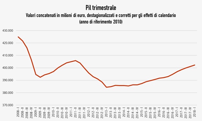 Come va l’economia reale dell’Italia? Nelle settimane in cui le forze politiche si dividono tra quelle che vorrebbero formare il governo ma non hanno numeri sufficienti e quelle che non vorrebbero assolutamente parteciparvi pur essendo desiderate, l’Istat ha comunicato i dati provvisori sull’andamento del Pil nel primo trimestre del 2018. In sintesi si tratta di un bicchiere pieno per un po’ meno della metà e vuoto per la restante parte, dipende dal punto di vista con cui lo si guarda, che è un punto di vista di breve oppure di medio-lungo periodo.