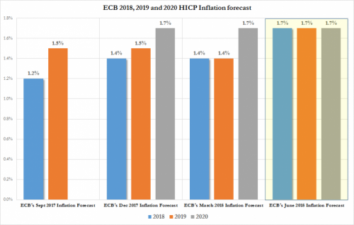 E’ la sintesi contemporanea del grado di disperazione della Bce e del suo aver raccontato l’ennesima bugia a fin di bene, quasi si avesse a che fare con un malato terminale che è inutile illudere, ma anche tormentare troppo con cure che sono ormai solo palliativi: al netto del taglio del tasso di crescita dell’eurozona per quest’anno dal 2,4% al 2,1% e al mantenimento di quota rispettivamente 1,9% e 1,7% per 2019 e 2020, la Bce ha portato il tasso di inflazione all’1,7% per i prossimi tre anni, uniformando perfettamente il dato da qui al 2020. E attenzione all’upgrade che ha subìto il dato per l’anno in corso, salito dall’1,4% delle previsioni di marzo all’1,7% attuale: a cosa è dovuto? Quasi interamente al mini-rally del prezzo del petrolio. E cosa significa questo? Che entro due settimane, quando l’Opec si sarà riunita e su mandato Usa avrà spedito pesantemente al ribasso il prezzo del greggio attraverso magheggi geopolitici sulle compensazioni delle quote iraniane formalmente destinate a uscire dal novero per le sanzioni, le prospettive inflazionistiche della Bce – nella realtà e in base a valutazioni macro di domanda/offerta – sono destinate a crollare.