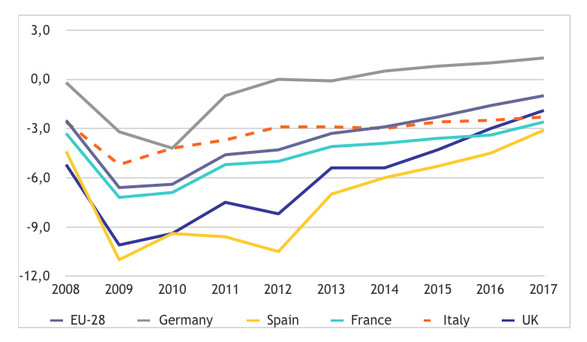 Nel tentativo di rispondere a queste domande conviene partire da un esame dei disavanzi pubblici dell’Italia nell’ultimo decennio, quello della grande recessione economica, rispetto agli altri maggiori Paesi europei.