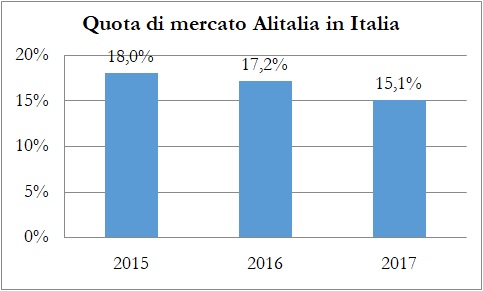A livello internazionale Alitalia trasporta circa l’8,5% dei passeggeri da e per l’Italia, circa un terzo di Ryanair e meno di Easyjet e il gruppo Lufthansa. La quota di mercato di Alitalia è ormai di circa il 2% a livello europeo, vale a dire che è un vettore regionale. Ad esempio, da Roma Fiumicino, hub della compagnia, non collega nessuna destinazione cinese, mentre le compagnie cinesi collegano Roma con 8 città differenti con 25 voli settimanali.