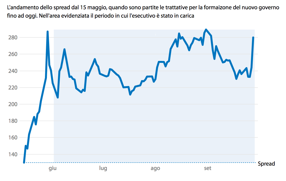 La nota di aggiornamento del Documento di economia e finanza (Def) presentata dal governo non è stata accolta bene dai mercati, che hanno visto, a fine giornata di ieri, un calo del 3,72% dell’indice Ftse Mib e una salita dello spread fino a 267 punti base, con un rendimento dei Btp decennali al 3,15%. L’allarme degli investitori ha indebolito tutti gli assetti finanziari italiani, con le banche in prima linea per i rischi patrimoniali e il rincaro del costo della raccolta. Sul versante internazionale, il problema non è se l’Unione Europea si farà una ragione di un rapporto tra deficit e Pil al 2,4% nel prossimo triennio, ma se il governo sia in grado di prevedere gli effetti di queste scelte sull’economia del Paese. Infatti, non vi è alcun automatismo tra un aumento del deficit e un impulso alla crescita economica.