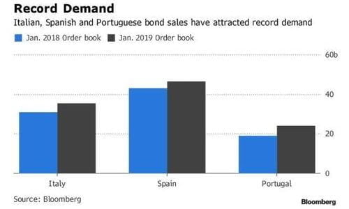 Nulla di nuovo, ve lo dico chiaramente da trimestri e, guarda caso, ora tutti sembrano concordare, seppur con differenti gradi di adesione alla nuova narrativa, al new normal. Ma c’è dell’altro e di più interessante, perché ci riguarda direttamente come Paese. Guardate questo grafico, ci mostra la comparazione degli order books di emissioni sovrane di Italia, Spagna e Portogallo di inizio anno con quelle del 2018 nello stesso periodo: è tornata la voglia di Club Med sui mercati! Non a caso, aste piene e spread fermo.