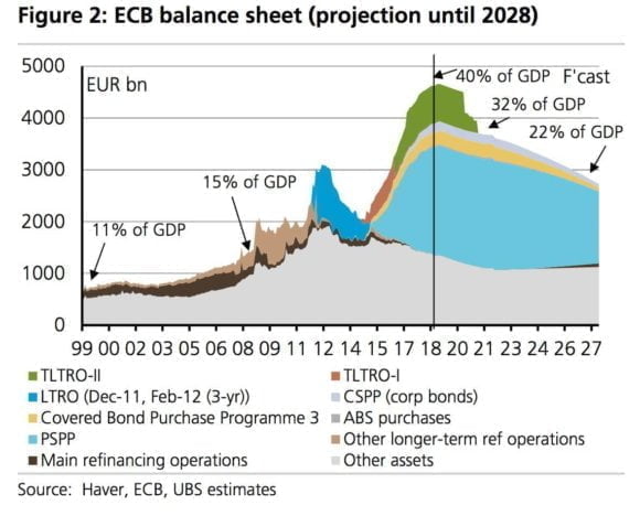 Fateci caso, non c’è più un telegiornale che aggiorni su quel dato: solo a novembre, era invece appuntamento fisso. Di più, Mario Draghi ha detto chiaramente che in caso di peggioramento della situazione, tutte le armi di cui la Bce dispone sono pronte a essere utilizzate: leggendo fra le righe, un annuncio indiretto di un cambio di forward guidance alle porte. Il grafico appena pubblicato parla chiaro: nelle proiezioni di Ubs, una nuova asta di rifinanziamento e di una certa entità è già scontata per mantenere il livello di espansione “tipo” rispetto al Pil. E come forse ricorderete, nel mio articolo dell’altro giorno vi davo conto del giudizio al riguardo espresso proprio dal presidente del Consiglio di amministrazione di Ubs, l’ex numero uno della Bundesbank, Axel A. Weber, a Davos. «Una politica di normalizzazione dei tassi in questo ciclo è già abortita», disse. Di fatto, l’atto primigenio del Qe perenne, in attesa di Fed e Pboc.