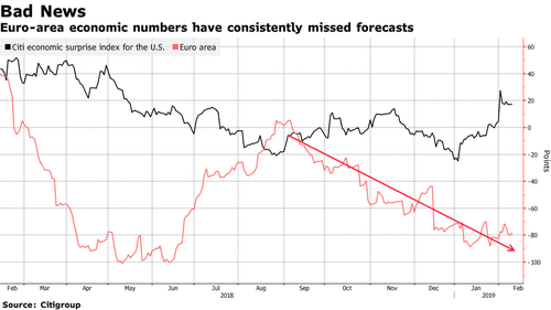 Pessima notizia, significa che siamo davvero nei guai. Anche perché contemporaneamente, i consumi privati sono cresciuti solo frazionalmente, nulla che da solo potesse controbilanciare il calo dell’economia produttiva nel suo insieme. E il secondo grafico è impietoso, perché al netto del mega-stimolo fiscale di Trump che ha garantito un boost a tempo all’economia Usa (e come vi ho anticipato, cesserà del tutto entro aprile), la comparazione di trend fra quest’ultima e i livelli di crescita europei appare disarmante. E spaventosa, perché la recessione ora andrà a impattare proprio partendo da quei livelli e quei presupposti. Per farla breve, se all’America basterà 100 da parte della Fed per guadagnare un po’ di tempo, la Bce dovrà mettere in campo 1000. E in fretta.