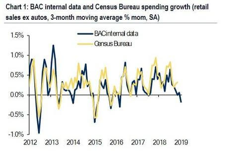 Sbagliato. Ce lo confermano due dati. Primo, la Coresight Research ha appena pubblicato il suo outlook 2019 dedicato alla chiusura di grandi punti vendita negli Usa, una sorta di summa dei maggiori studi e report sull’argomento. Bene, a oggi negli Stati Uniti i grandi marchi e le grandi catene hanno già annunciato la chiusura di 2.187 negozi fisici, di varia grandezza e importanza. A metà febbraio siamo già a questo livello, un +23% rispetto all’anno scorso. Secondo, questo grafico era contenuto nell’ultimo sondaggio di Bank of America fra i principali gestori di fondi e rivela il risultato del famoso e quasi sempre precisissimo Internal spending data della banca d’affari, basato sulle spese aggregate con carte di credito e debito. Escluso il mercato auto, il dato a di gennaio ha segnato un -0,3%, il maggior calo da tre anni a questa parte. Il tutto, dopo un dicembre – stagione dello shopping per antonomasia – totalmente piatto.