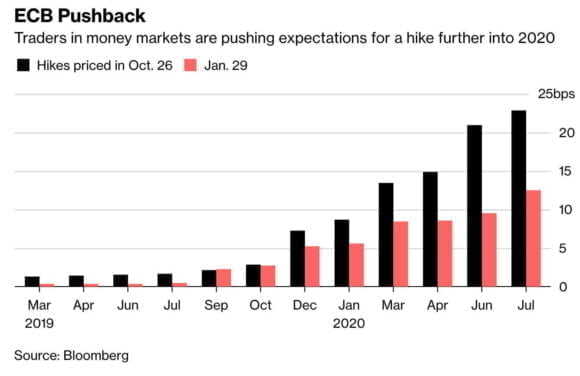 Come la Boj. Come la Fed. Come la Pboc. Allarme generale. E, cosa più importante all’interno della nemesi, senza che la Bundesbank stia aprendo bocca sull’operato dell’Eurotower. Ormai da mesi. Persino quando l’inflazione in autunno superò e di parecchio la soglia-obiettivo del 2% e la bolla immobiliare tedesca, gonfiata proprio dalla politica di tassi sottozero della Banca centrale, cominciava a inviare sinistri scricchiolii di espansione reale. Tutti muti, a Francoforte come a Berlino. Avete notato? E il mercato che prezza ormai la probabilità più credibile di un primo rialzo dei tassi da parte della Bce nel 2020, come certificato da Bloomberg e mostrato da questo grafico, giova ricordare che a metà della scorsa settimana il titolo Deutsche Bank ha ripreso il suo calo, dopo che il Governo tedesco ha confermato la sua attività di mediazione fra i management del gigante del credito (e, soprattutto, del trading desk) e Commerzbank, secondo istituto del Paese e già salvato una volta dal default, per una fusione che abbia luogo entro la metà di quest’anno.