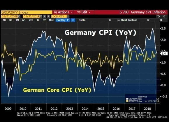 Fuochino. La risposta è qui, in quella che potremmo definire la maledizione di Weimar. O, meglio, la nemesi di Weimar. Il tasso di inflazione tedesco, infatti, è sceso a gennaio all’1,4% contro l’1,7% di dicembre e, soprattutto, il 2,5% di ottobre. E se lo spettro dell’iperinflazione che lastricò la strada al Terzo Reich è da sempre motivo di allarme ed eccesso di rigorismo da parte della Germania – leggi, Bundesbank -, ora quel calo del grande pericolo viene benedetto una seconda volta. Non perché vi sia un altro Adolf Hitler alle porte, come qualche poveraccio strepita, ma per il semplice fatto che un calo simile, unito alla contrazione del terzo trimestre e al dimezzamento delle stime di crescita, stendono un tappeto rosso alla Bce per interventi emergenziali e condivisi.