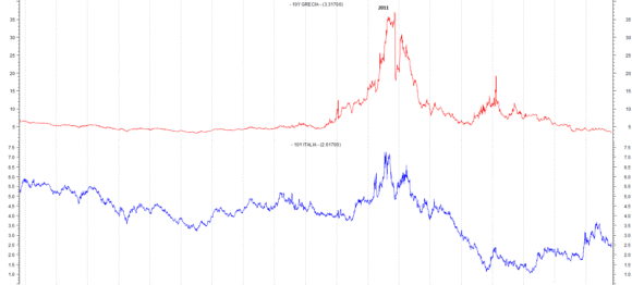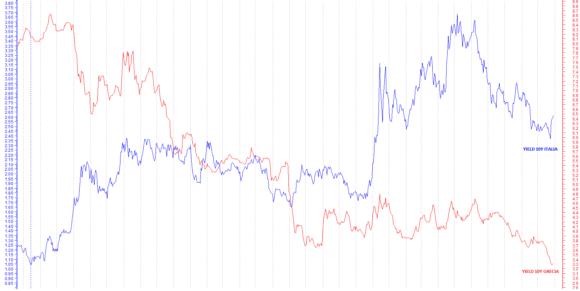 Il rendimento dei bond greci decennali è sceso ai minimi da 14 anni. Questo potrebbe diventare un problema per i nostri Btp