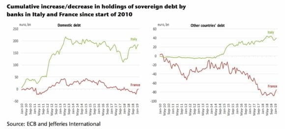 Nella fattispecie, prende in esame le criticità del sistema bancario. In particolar modo, il famigerato doom loop, ovvero il rapporto incestuoso fra banche e detenzione di titoli di Stato. L’Italia, si sa, è campione assoluto da anni in questa poco onorevole disciplina. Ma, come vedete, anche la Francia sta andando alla deriva in tal senso. E non da oggi. Qualche cifra. A dicembre, quando ancora per un mese la Bce era operativa con gli acquisti di titoli pro quota, i nostri istituti di credito vollero mostrarsi belli ai mercati, vendendo un controvalore di 17 miliardi di titoli di Stato in detenzione. Come dire, siamo sani come pesci e possiamo dimostrarvelo, intervenendo sul nostro storico nervo scoperto. Bene, sapete per quale controvalore sono tornati ad acquistare debito a gennaio e febbraio, ovvero quando lo schermo anti-spread della Bce si è limitato (ed è un bel limitarsi, fidatevi) al reinvestimento della carta in detenzione e a scadenza? Per 11 miliardi a gennaio e per 7 a febbraio: di fatto, completo off-set delle vendite-spot di dicembre. Siamo da capo, altrimenti addio spread fermo in area 250-260. E attenzione, perché in gennaio e febbraio le banche francesi hanno fatto di peggio, acquistando titoli di Stato per 21 miliardi di euro. In entrambe i casi, domestici ed esteri. Immagino, statunitensi. Almeno nel nostro caso. Mentre in quello degli istituti d’Oltralpe, penso che siano molti i Btp fra i titoli acquistati, non fosse altro per gli interessi che i francesi hanno nel comparto, a partire da Generali.