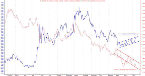 Andamenti opposti e contraddistinti da una marcata correlazione negativa tra i due trend. La medesima che, negli ultimi due mesi, si è potuta registrare sugli stessi andamenti dei rispettivi rendimenti associati ai titoli decennali nazionali oggetto di differenziale finanziario. A marzo, il rendimento del Bund si attestava ad area 0,1220%, mentre per il sottostante domestico si registrava un 2,454%. Da allora, come appare ormai evidente, si è potuto assistere a un significativo incremento di quest’ultimo rispetto a un opposto andamento del teutonico strumento che, tornando nuovamente a valori negativi, ha di fatto contribuito maggiormente a enfatizzare la differenza tra le due realtà europee.